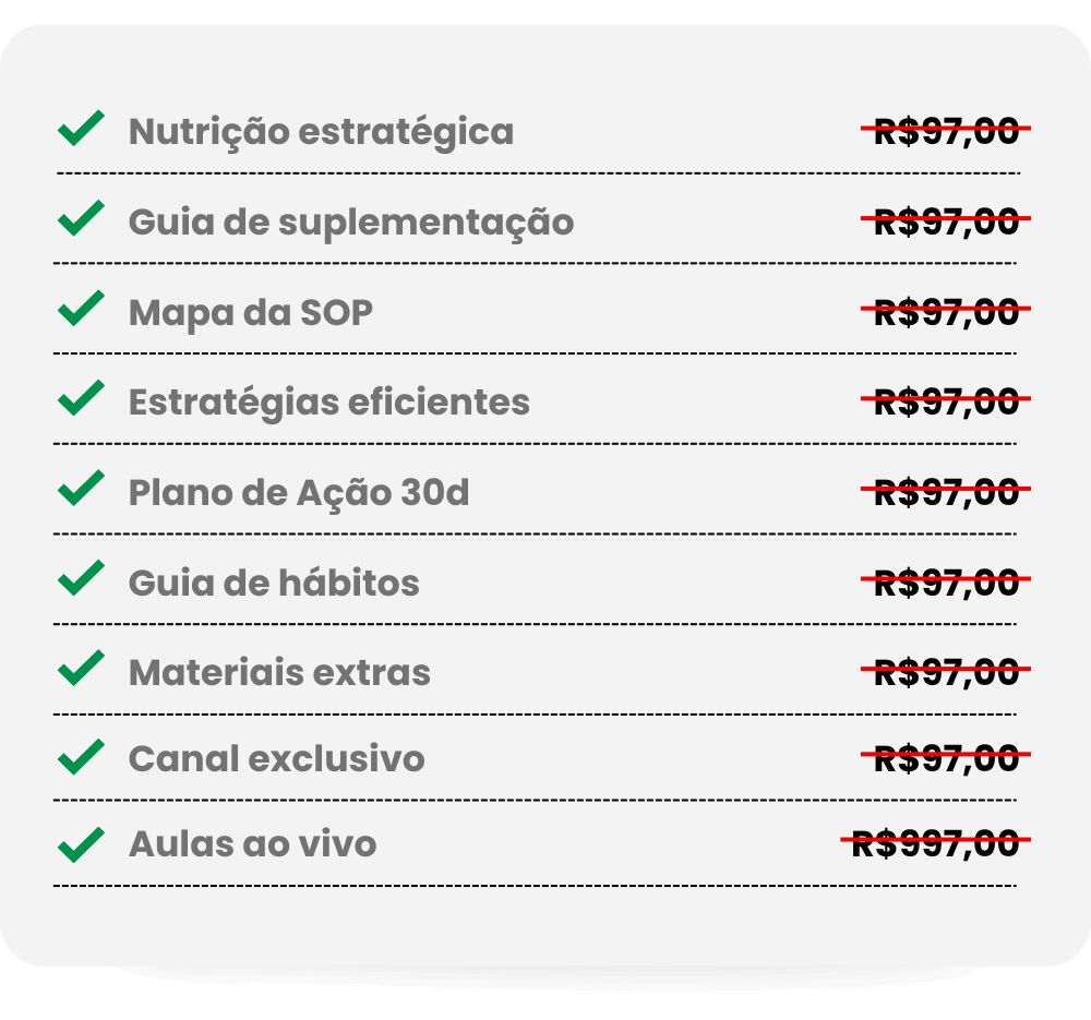 Investir apenas 127 reais no Programa de Controle da SOP e aprender, de forma clara e leve, como equilibrar seus hormônios, cuidar da resistência à insulina e reduzir os sintomas que tanto te incomodam.